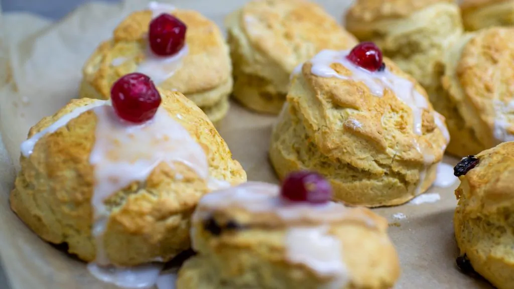 Make a paste by adding sip after sip of water to the icing sugar. Stop adding water when the glaze is liquid but not runny. Add a bit of icing to each of the scones and add a candied cherry on top.